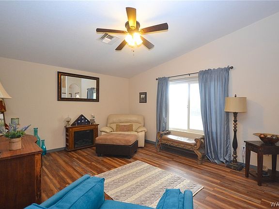 Welcome to this lovely 3-bedroom, 2.5-bathroom home nestled on an oversized lot that offers plenty of space for all your toys, including RV and boat parking. Situated in the tranquil neighborhood of Cimarron Lakes this property boasts a large, fenced backyard located on a cul de sac lot with no homes directly behind it providing for both privacy and Serenity. Step inside, and you'll be greeted by a recently renovated interior that includes a brand-new kitchen and updated flooring. The kitchen is open to the dining and living areas. Large, picturesque windows provide plenty of natural lighting in the living room. This home effortlessly combines comfort and functionality, making it the perfect choice for those seeking a move-in ready property. You'll be delighted to discover a spacious bonus family room and 3rd bedroom that has added an additional 540 square feet of living space for your enjoyment. But that's not all! The front and back yards are adorned with mature shade trees and lush landscaping, providing a peaceful oasis to call your own. For those outdoor enthusiasts, the generous back patio offers ample room for entertaining friends and family, and the expansive lot leaves space for your dream pool, side parking, and has convenient shed for all your storage needs. And the perks don't end there! As a member of the Willow Beach Club Association, you'll have exclusive access to their private beach along the breathtaking Colorado River. Privileges include dedicated boat and jet ski launches, ensuring your aquatic adventures are always within reach. The beach area itself offers ample space for relaxation and recreation, complete with cabanas for shade and comfort, creating the ideal setting for leisure and enjoyment. Enjoy all the Colorado River has to offer and let's not forget those amazing Arizona sunsets. Seize this incredible opportunity to own a spacious piece of the gorgeous Arizona desert in a highly sought-after location of Cimarron Lakes.