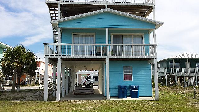 Beautiful single-family house in 8-home community on Little Lagoon. Set up as condo with shared pool. Furnished in colorful, beach-style decor, with huge balcony overlooking the lagoon from living room and master bdrm. A rooftop sun deck offers panoramic views of the Gulf and lagoon. Covered parking with huge storage room. Quiet, private, and short walk across the street to the beach.
