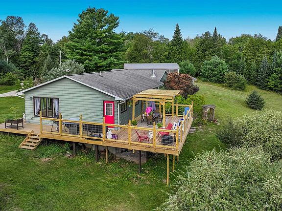 This stunning 20-acre property offers natural beauty and modern comfort, with the Beaver Creek flowing across this land. It's a true hunter's paradise, where trout fishing and hunting are just steps away from your door. This ranch home has 3 bedrooms and 2 baths with a full walkout basement that adds additional living space, storage, and private patio area. A newly built warp-around deck provides breathtaking views of the surrounding landscape and to enjoy the changing seasons. The kitchen has a custom-built island, a large pantry, double ovens and newer appliances. The open floorplan showcases beautiful hickory floors. Amenities include 2-car attached garage, 38' x 18' RV storage, a chicken coop, and a shed. Easy access to US 131 for a convenient commute.