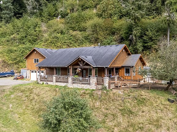 Exquisite custom built home in the desirable Wilson River Valley! This home blends high end finishes with rustic charm and modern comforts. Adorned with rock accents on its pillars, the covered front porch, crafted from reclaimed redwood timbers, welcomes you into a haven of natural beauty. Inside, vaulted ceilings enhance the spacious ambiance, complemented by a grand wood stove for cozy evenings. The chef's style kitchen features Frigidaire stainless steel appliances, state-of-the-art hood vent, solid granite counters and an ideally long eat up bar for entertaining. Redwood floors add warmth throughout, leading to two luxurious en-suite bedrooms with custom tile floors and showers. The master bath features double sinks, Labradorite counters, and a stunning shower with five shower heads, offering a spa-like experience.A separate living space above the garage provides flexibility for guests or a private retreat. Outside, a custom-built smokehouse and two stainless steel fish cleaning stations (one with hot/cold water) are perfect for your trophy catch on the Wilson River. A chicken coop with a convenient garage-style door, a pig pen, dog run and some apple trees complete the homestead, offering rural living at its finest.