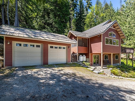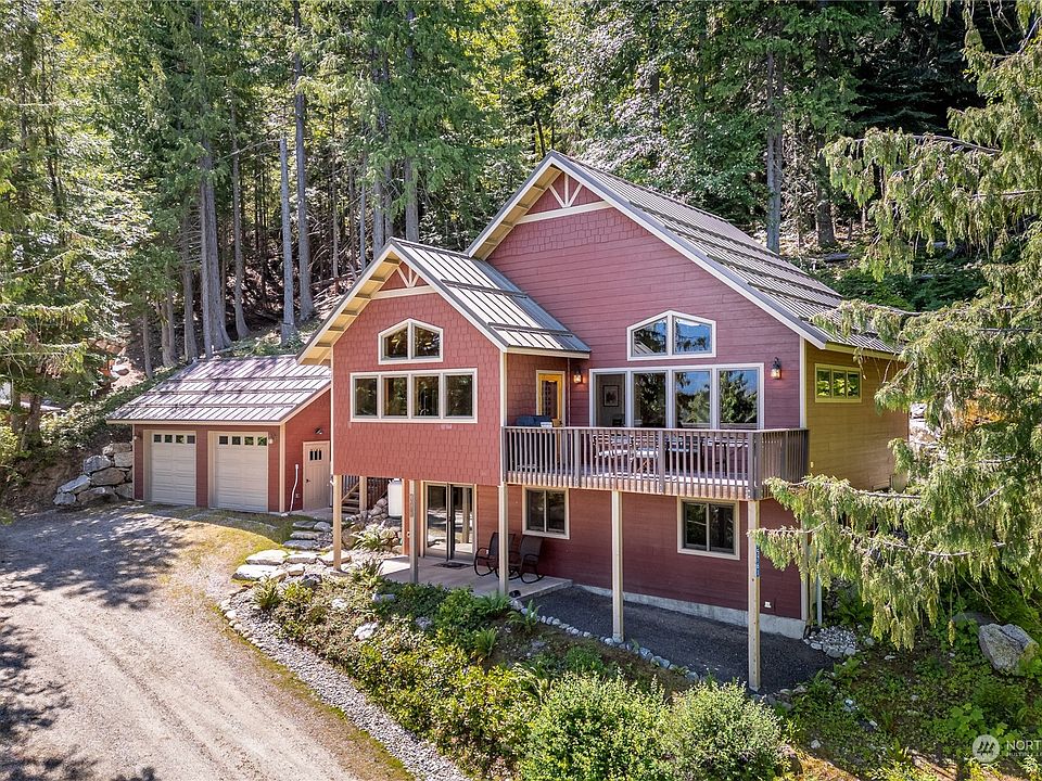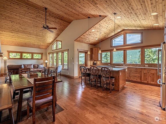 Experience spectacular views from this thoughtfully-designed, fully-furnished home overlooking Lake Wenatchee! The spacious kitchen and lovely great room are perfect for entertaining. Vaulted wood ceilings, log accents, double-sided propane fireplace, and maple hardwood floors enhance the main floor's charm. The attractive kitchen features a large center island, quartz countertops, Viking propane cooktop, classic farm sink, and alder cabinetry. The lower level features stained concrete floors with radiant heating, three bedrooms, and a cozy nook. Two-car garage for parking and storage, and the property backs up to the National Forest, offering superior privacy. Located just minutes from the State Park, hiking, and x/c trails.