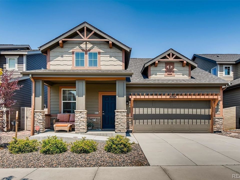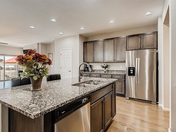 This home is in one of the newest communities in the area with its parks, Trails, Club house and lots of amenities it's the community's gathering hub. Enter the home to a Spacious receiving Room then walk into the open concept kitchen with its Island and eating space, then flowing into the family room with high ceilings, its fireplace and abundance of natural light. Beautiful two-bedroom, two bath ranch style home. The basement is large and ready for you to finish the way you want it. Gourmet Kitchen with Stainless Appliances that make the home inviting to your guests and ready for entertainment. The carpet in this house has been replaced. The Main Floor Master features a walk-in closet and a Full 5-piece bathroom. Attached to the home, a two-car garage. There is space on the driveway to park two other cars. The Patio has Low Maintenance Turfed Backyard and beautiful sunset views. Just a block away is the community club house with pool, hot tub, indoor/outdoor kitchens, and much more to recreate family and friends. This community is perfectly located between Downtown Denver and DIA easy access to Pena Blvd and Chambers then to I70 for commuting! Don't wait. Schedule a showing and make it yours! Seller is related to the Seller`s agent