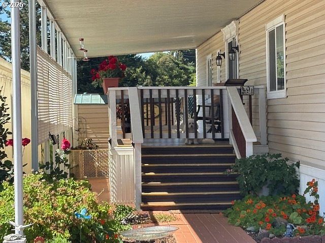 WITH SUBSTANTICAL DOWN PAYMENT OWNER WILL CONSIDER CARRYING LOAN. From this well cared for gem with peeks of the ocean and lovely sunsets. Park is 55+. This home has many upgrades, vaulted ceilings, dual pane windows, new enlarged covered deck with gate, LVF flooring in living room and dining and kitchen area. Carpet in bedrooms. This home has plenty of storage both inside and out. It has a pantry inside and an 8x10 shed outside. This home is turnkey and ready for it's new owners. EVEN COMES COMPLETELY FURNISHED. Park rent includes water, sewer and garbage. Plus park amenities like well maintained grounds and a private pickleball court. This home is close to shopping, the beach and restaurants. Set up a showing today, this one is worth looking at. Yard is fully fenced and ready for a small dog.