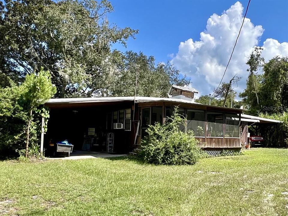 This quaint home is nestled in the Ocala National Forest, surrounded by trees and wildlife. If you're looking for a quiet, off-grid retreat, look no further! With almost two acres of land, you're sure to make this property your own peaceful haven. This home is being sold partially furnished. It has an oversized screened in front porch with plenty of space for relaxing with loved ones. Upon entering the house, you are welcomed into the cozy living room, and the main bedroom with walk in closet is off to your left. Just off the living room is your open kitchen with an eat-in nook. Down the hall is your second bedroom with large closet, and 1 full bathroom. Continuing down the hallway, you have a pantry and laundry hookups, as well as a second entrance to the home. Two carports flank the house offering plenty of parking space. Additionally, there is a detached studio bunkhouse with kitchenette. There's a 40 foot container on the property for lots of additional storage, as well as a work shed. There is another structure that could be a separate house with some renovation; it has water, plumbing and electric. There are two septic systems and two well water sources. This home will need some repairs and is being sold AS IS. More photos will follow.