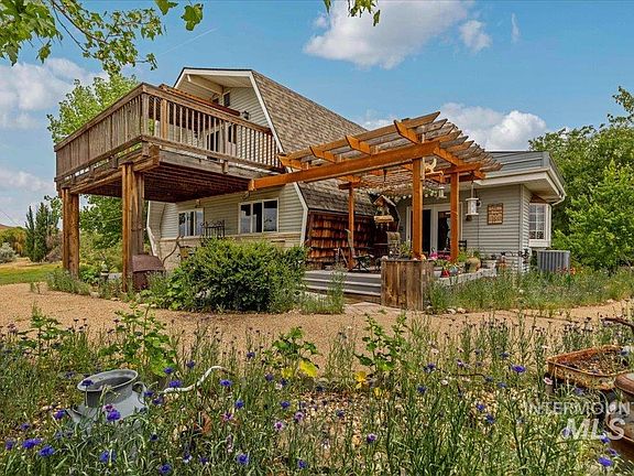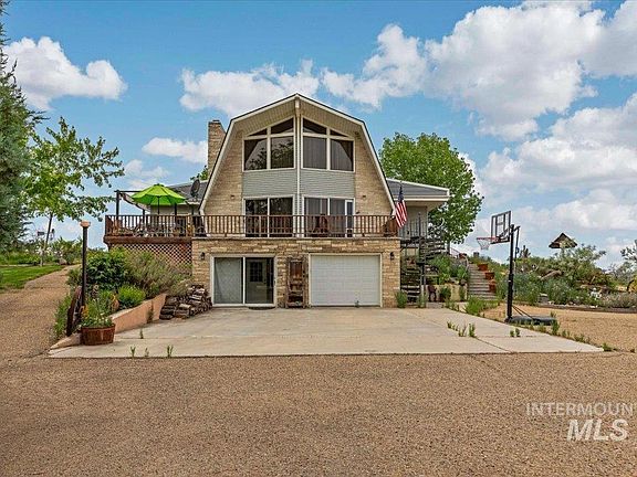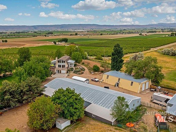 Private country home with 5% interest owner financing near Idaho's wine country, boasting stunning Snake River Valley views. Park-like outdoor space with a spring-fed pond, fire pit, private drive & beautiful landscaping. 7.95 acres of irrigation water rights for the pasture. The outbuildings consist of a fully insulated 50x130ft shop with 220V power & hot water, a 31x64 insulated shop with hay storage & an RV Bay, & a 40x72 ft shop with a paint booth & 3/4 bath. The inviting home boasts a sauna, jetted tub, custom bar, Trex decks, upgraded kitchen w/ double oven & copper accent backsplash. Private upstairs primary suite w/ deck & loft. Owner financing available with 50% down & 5% interest. Domestic water and irrigation water are spring fed. Domestic water is delivered via gravity flow and pump. Irrigation water is gravity flow via a ditch & hand lines.