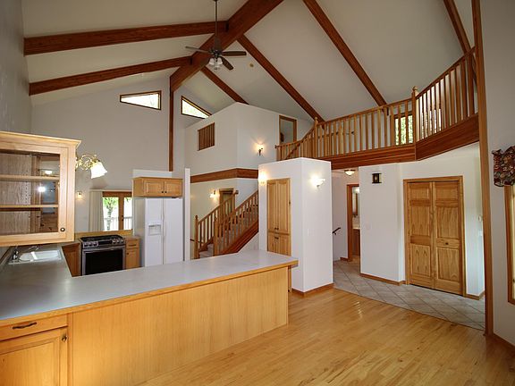 This year-round lakefront home on Fish Lake is perfect for those seeking ample space for both themselves and their guests- a spacious and inviting retreat with immaculate design. The main floor features a 22' vaulted and beamed ceiling, a large living room with a gas fireplace and a 9’ garden door to the deck overlooking Fish Lake. An open kitchen with Hickory cabinets and a large pantry, generously sized primary bedroom with a walk-in closet and private bathroom, and a guest half bathroom with laundry complete the main level. Upstairs, a loft area and a bedroom provide additional sleeping space and beautiful lake views. The lower level includes a walkout family room to the patio, mechanical room/storage with a kitchenette, and a bonus room. Situated on over half an acre, the property features a two-stall garage with a heated shop, additional parking, front and back decks, and captivating landscaping. Don't miss the chance to own this idyllic lakeside retreat with breathtaking views.