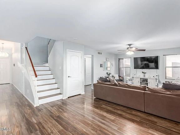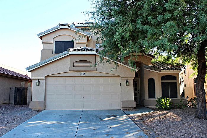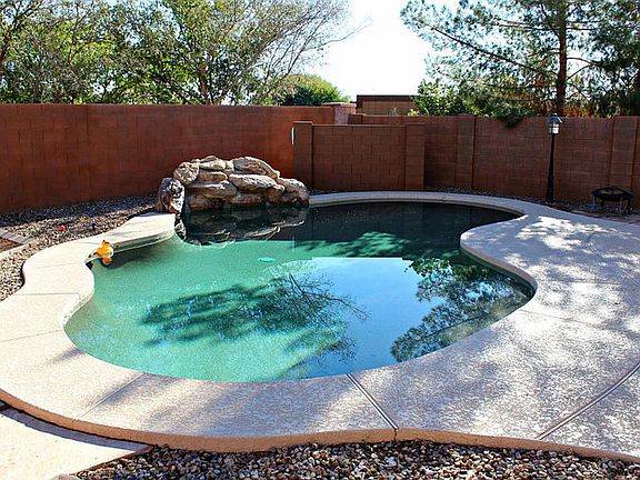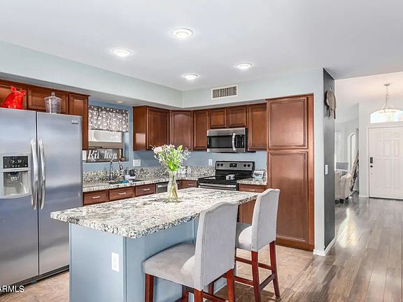 This Surprise 4 bedroom, 3 bath has a two car garage, large lot, and pool with routine service included. Upgraded kitchen with granite counter and stainless appliances. Wood and tile flooring combination downstairs with carpet in the bedrooms upstairs. Primary bath has marble counter with double vanity, separate tub/shower and walk-in closet. Backyard has a large, covered patio and shade trees front and back.