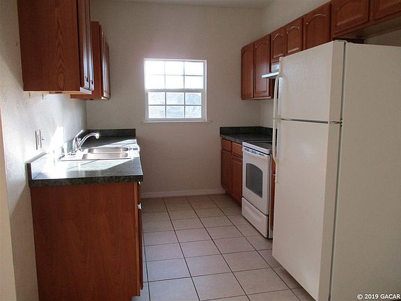 2/2 ( Eagle Trace) Charming, updated townhome. Unit is in a great location, convenient to UF, Shands, schools, shopping & restaurants. 2nd floor- flat unit . Tiled floors in living room, kitchen, dining room and baths. Kitchen has white appliances and updated wooden cabinets. Laundry closet with washer and dryer connections only and storage. Hall bath room with tub/ shower combo. Master bedroom with large walk in closet and full bath with tiled shower stall. Bedrooms are carpeted. Community pool ,club house and gym. 1 small pet only. est sq ft 1188