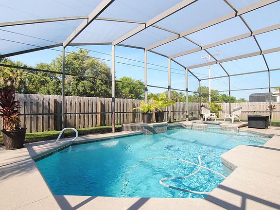 This Popular Island Crossings Pool Home is situated to allow lots of privacy. Open & Split Floor Plan with 4 Bedrooms 2 Baths, Updated Guest Bath opening out to the pool. Formal Living and Dining Room, Updated Kitchen w/ Granite Countertops & Stainless Appliances. Kitchen & Pub Area opens into the Family Room which opens out onto Screened in Heated Pool w/Dolphin inlays & hot tub area, a true Tropical Paradise! Master Suite with Updated Bath to include shower & separate Jetted Tub. Fenced Yard enclosing side Boat Storage. Location - Location, easy access to the Beachline (528 cswy) few minutes to Port Canaveral, CCAFS, KSC, shopping, beaches and on to Orlando, less than an hour to Airport. Great Schools and Parks just minutes away. See Floor Plan Attached.