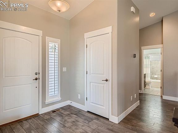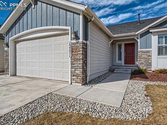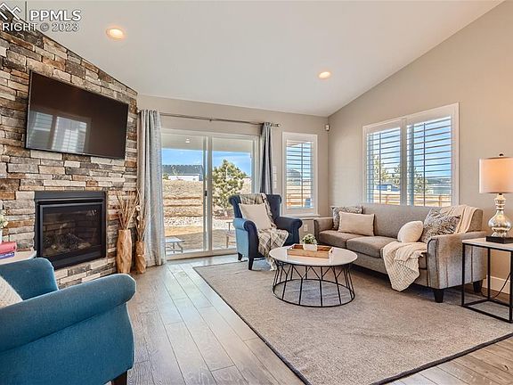 Beautiful home built by Classic Homes in Forest Lakes! Drive in to one of the few Colorado subdivisions with it's own private lake! This ranch floor plan has vaulted ceilings, plantation shutters and an open concept for easy entertaining! Welcoming entry with closet and wrought iron pickets leads to family room with cozy fireplace, durable Mannington plank laminate wood floors and room for large furniture! Family room walks out to a covered patio and expanded circular stamped concrete sun patio with views of the front range! Surround sound in the family room and patio! Dining area has large window for natural lighting and kitchen has quartz counters, 42" cabinets and under cabinet lighting! Stainless steel appliances with gas stove, large pantry and room for a bistro table! Main level private master retreat has vaulted ceilings, walk in closet and barn door to the spa like master bath! Enlarged shower, quartz counters, two sinks, taller cabinets and linen closet make for easy living every day! Second bedroom on the main level also has a walk in closet! Full bath and a large laundry room on the main level gives you one floor living! The 9' ceilings in the basement bring in extra light. The custom wet bar with fine details is a highlight of the basement: full cabinets, open shelves, full fridge, quartz counters and a hand made live edge bar top sets this basement apart and shows the attention to details throughout the home! Two more oversized bedrooms in the basement share a full bath with quartz counter and subway tile! Lots of closets and storage as well! Oversized two car garage with four foot extension and eight foot doors! Some rooms have surround sound and some have prewire! Security system prewired.