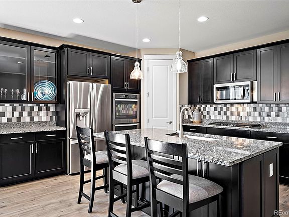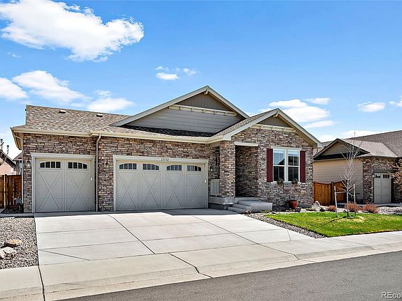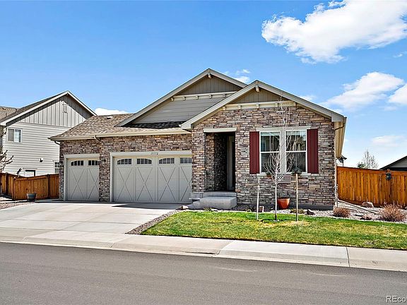 HIGH-END FINISHES, AFFORDABLE LUXURY, and READY FOR YOU TO MOVE IN! Why wait for a new build when you can move into this beautiful, like-new, ranch-style home with ALL of the upgrades?! Stunning, well-maintained 3-bed, 2-bath home with a separate office/flex space, a large backyard (lot premium!), and the COMPLETE PACKAGE of upgrades. The main level features beautiful, luxury plank vinyl, custom window treatments, upgraded light fixtures, a modern gas fireplace, 9-foot ceilings, and an abundance of natural light. You'll be sure to notice the high-end finishes in the kitchen, complete with custom cabinetry, soft-close doors and drawers, slide-out shelves, granite counter-tops, a large eat-in double-island, stainless steel appliances and gas range, double oven, and plenty of counter-top space and cabinet storage for all your kitchen, dining, and entertainment needs! The main-level primary bedroom features a large, walk-in closet, and a luxurious en-suite bathroom with an extended double-vanity, granite countertop, and an oversized, custom step-in shower. There are two additional bedrooms on the main level, a full bathroom, a private home-office with french doors, and a separate laundry room. Need even more space? The large, unfinished basement is ready for your personal touch and can be finished to include another bedroom, bathroom (rough-ins installed), and a large bonus room. The expansive backyard is perfect for bringing everyone together or for simply enjoying the beautiful Colorado outdoors. Relax on the covered patio, spend time in the garden, or entertain on the bistro-style stone patio. The 3-car, attached garage is fully insulated and has an access door to the backyard. Located in the esteemed Trailside Community with mountain views, a 5-acre park with soccer fields, sand volleyball and basketball courts, playground, picnic pavilion, BBQ pits, and within the Adams 12 Five-Star School District boundary. There's plenty to appreciate about this home!