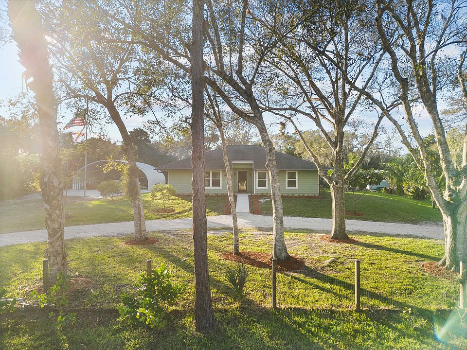 Escape to your serene oasis in Palm Beach Country Estates! This beautiful country home on over an acre offers spacious living with vaulted ceilings, fireplace and large screened in back porch. With a sprawling backyard with Key Lime, Myer Lemon, Persimmon, Guava, Mango, Avocado, and Rudy Red Grapefruit trees. Additional features include a new 40x40' Quonset Hut and proximity to the foot bridge to the enchanting River Bend Park. This horse-friendly community has no restrictions, allowing freedom for boats, campers, and trailers. Roof in 2005, AC is 2011 and Hot Water Heater 2015. Conveniently located near restaurants, and shopping, this property invites you to embrace the unique lifestyle of Palm Beach Country Estates. Schedule a private viewing today .