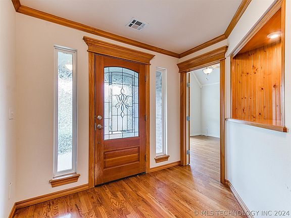Welcome to Fossil Ridge, where tranquility meets luxury in Collinsville, OK. Nestled in a highly desired gated cul-de-sac street, this custom-built brick and stone home offers an unparalleled living experience. As you drive through the gates of this exclusive community, you'll be greeted by the serene ambiance of mature trees and the peaceful charm of small-town living, while still being just moments away from all the amenities of the city. Step inside to experience this incredible home with hardwood floors, custom built-in’s, a spacious kitchen with Italian granite boasting an abundance of storage, stainless steel appliances, and a convenient walk-in pantry. With a thoughtfully designed split floor plan, this home offers privacy and comfort with three bedrooms downstairs, including a private master suite. Designed with tray ceilings, the master suite features beautiful views and direct access to the backyard, creating a serene retreat. The luxurious master bath boasts a separate shower, dual vanities, and a huge walk-in closet with safe room, providing ample space for all your needs. Upstairs, a versatile flex space awaits, complete with a second living area with fireplace and wet bar, fourth bedroom and full bath. Plus an extra walk-in closet perfect for storage or seasonal wardrobe closet. Enjoy breathtaking views from the screened-in patio. Enjoy the full 3 car garage with large additional workspace area. Additional 1 car garage/workshop with separate drive. Don't miss this rare opportunity to experience the perfect blend of luxury, convenience, and tranquility at Fossil Ridge. Property Selling As-is for new buyer to make updates and really make this home perfect for a growing family.