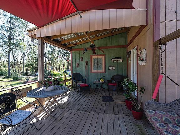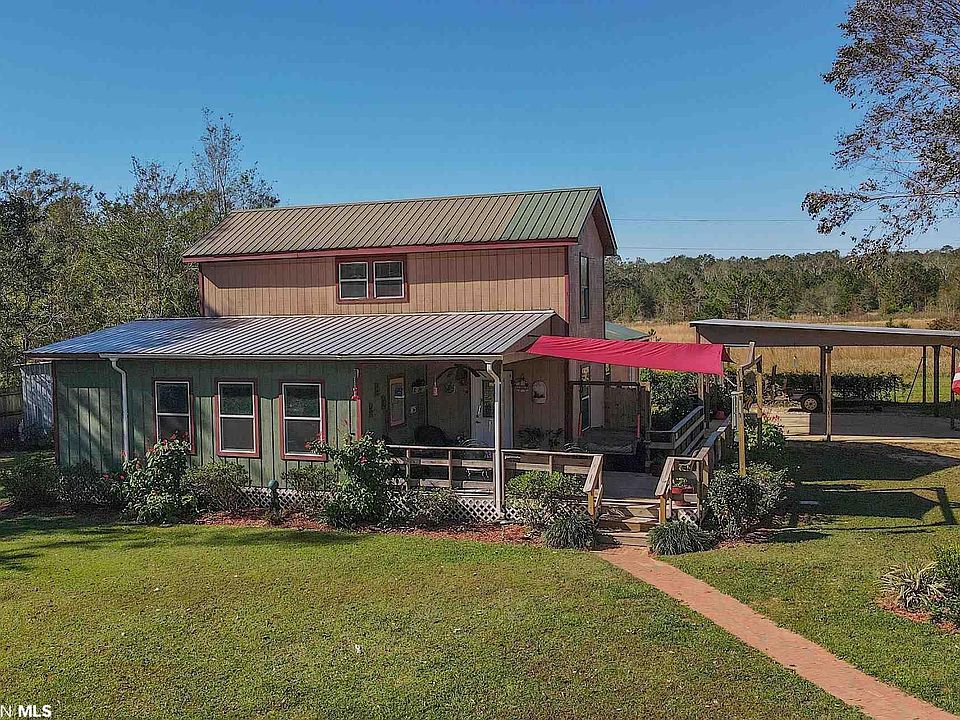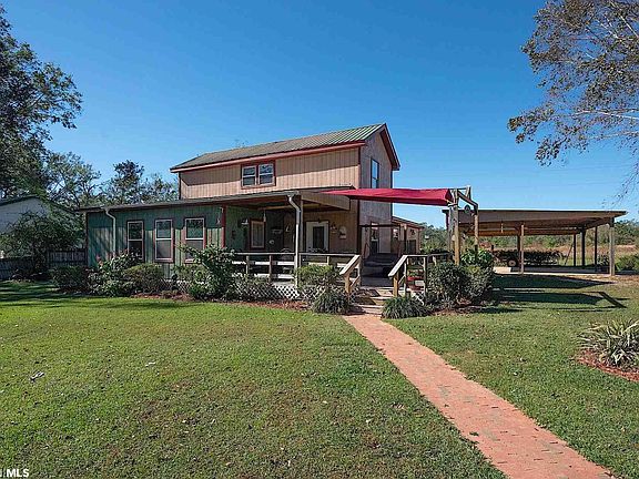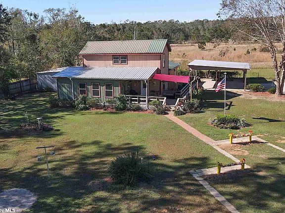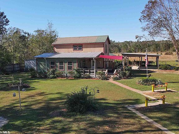 This well built farmhouse style home sits on a lovely manicured lot in a very desirable area between Foley and Magnolia Springs. Enjoy country living just outside of the heart of one of Baldwin Counties fastest growing areas that is minutes away from the beach. Totally custom designed home with beautiful wood accent features, wood flooring throughout most of the home. A large porch area welcomes you into this home where you will find a very sunny living and dining area, larger style galley kitchen, some handmade cabinets, some refurbished cabinets, two master suites downstairs, one built to accommodate special needs with wider doors and walk in shower and easily accessible sink. Also downstairs is a half bath for guests, an oversized laundry area and the main suite has its own exterior access with porch. The property offers a large two car carport, two workshops one is 16x20 the other 8x8 both have power. Property is also gated and fenced. This is a must see. Shown by appointment only. One of the better built homes around, built by hand and solid! Homeowner built with pride and to all building codes per owner.