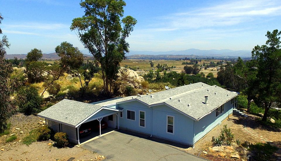 Beautiful Hilltop with amazing views! This home on 4.15 acres in desirable WEST END Ramona is ideal for horse/animal lover or garden enthusiast! Rocky outcroppings, mature oak trees, privacy and open spaces abound! Excellent investment in an area of attractive homes on a paved road. Lot is over 4 acres, potentially can be split into two parcels. Huge out building with parking for 4 cars; plus sea trains for storage. Home is a Silvercrest factory built home; custom floorplan built in 1989. See Supplement