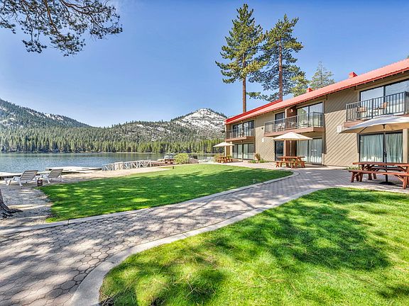 Welcome to the lakefront paradise at Donner Lake Village! Nestled along the West End of Donner Lake, this mountain retreat offers the perfect blend of serenity and outdoor adventure. This stunning studio has been masterfully renovated throughout, with no detail overlooked. Featuring an exceptionally cozy open floor-plan; complete with new new light fixtures, luxury vinyl plank flooring, and a gorgeous mountain-modern red cedar wall. This unit is one of the few in this complex that features a full size kitchen area; including a large refrigerator, full size oven & range, microwave, updated large sink, and sparkling quartz countertops. Conveniently located in a private alley just steps from the water’s edge, yet sheltered from snow and sun exposure. The large back-door slider provides instant access to all of the outdoor amenities. Residents have exclusive beach access, usage of common areas with lush lawns, barbecues, picnic tables, saunas, and a private boat dock! Trailer parking is offered for residents while the boat is in the water! On-site laundry rooms are available, as well as access to the private indoor fireside lounge where you can relax while overlooking the breathtaking panoramic mountain and lake views. The HOA offers an in-house rental program with a staffed front office to assist with all of your rental desires. HOA dues cover Internet, Cable, & Utilities! The possibilities are endless at Donner Lake Village- enjoy Kayaking, Paddle-boarding, Fishing, Swimming, Boating, & more. Donner Lake offers dozens of nearby hiking and biking trails, and is located minutes from World-Class skiing and snowboarding! This location is ideal for any outdoor enthusiast. Whether you’re seeking a seasonal escape, or a short term rental investment property, this stunning condo offers enjoyment and entertainment throughout the beauty of every season. This unit comes completely furnished for your instant enjoyment or rental convenience. On Site Rental office facilitates all rentals for the complex, housekeeping, and maintenance for units on the rental program with a 60/40 split (40% to rental office). Offered for sale right in time to get your front row seat to enjoy the West End Fourth of July fireworks! Don’t miss out on this gorgeous lakefront condo!