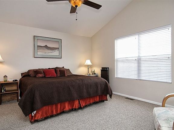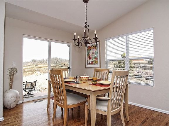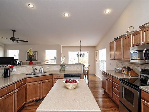 Well cared for 3200+ Sq Ft Ranch Home in Jackson Creek! Kitchen boasts maple cabinets with pull out drawers, Corian countertops, tile backsplash, SS appliances, wood floors and opens to the great room. Vaulted Master Bedroom with 5 piece bath and walk in closet plus 2 additional bedrooms on the main level. Finished basement to include 2 spacious bedrooms and wet bar. Oversized 2 car garage and A/C. Beautiful landscaping, auto sprinkler system and fantastic views of the Front Range with home backing to open space. Community park located across the street from home. The rocks on the east side of the property bordering empty lot are maintained by the HOA.