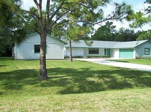 Fantastic pool home in Palm Beach Country Estates. This spacious bright ranch home has three bedrooms, two baths, screened Florida room overlooking pool patio, with a two car garage and detached two and half car garage. It stands on 1.15 acres, fully landscaped with mature trees and tropical plants. This immaculate home has 18" neutral tile floors throughout main living areas and offers a large formal living and dining room with French doors that open to the screened Florida room. A wet bar and cabinets add storage space for outdoor items. The Kitchen has many oak cabinets, drawers, plenty of counter space and opens to a family room with French doors leading to a den/office or possible 4th bedroom with lots of windows overlooking the backyard and pool.