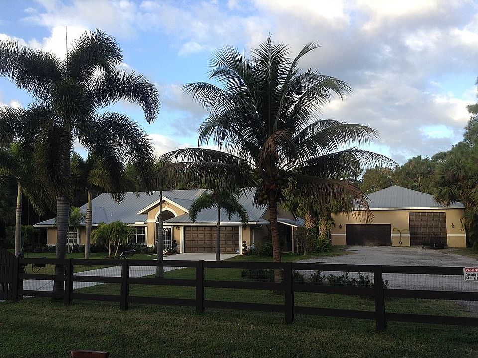 Realtors welcome- 3% commission Pristine and private four bedroom home located in beautiful Palm Beach Country Estates. Cathedral ceilings and lots of windows make this home airy and bright. Bring your boats and RVs to this 45‘ x 45‘ CBS spacious garage. It can fit 9-10 cars! Brand new beautiful travertine pool under screened cage, Gorgeous fire pit with pavers. All new hurricane windows and sliders. Brand new hurricane skylights. New AC unit. Newly renovated kitchen with granite countertops and stainless appliances. Wood burning fireplace with built ins on each side. Plantation shutters. Solar gate for the house and double gate entry to the garage. Mature landscaping and trees. There is nothing to do but move in this house and enjoy all it has to offer. Don’t wait! Please call for showings. Realtors welcome with qualified buyers. Will Pay 3% commission. Please Do NOT solicit