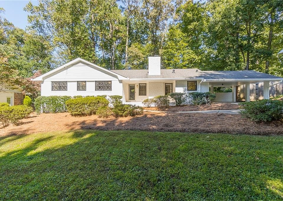 Beautifully renovated and move-in ready ranch home in Dunwoody! Gleaming hardwood floors, freshly painted inside and out, this 3-bedroom, 2-bath home offers more than meets the eye from first glance. Charming front porch overlooks a newly landscaped front yard on a quiet cul-de-sac street. Open kitchen features soapstone countertops and marble backsplash, newer white Shaker-style cabinets, and stainless steel appliances, including 5-burner gas range, vent hood, dishwasher, microwave; window over the sink brings loads of sunlight. Breakfast bar overlooks fireside keeping room with wood-burning fireplace for cozy evenings around the original brick hearth. Huge living room/dining room combo offers flexible space, which opens into a beamed sunroom with walls of windows overlooking the private backyard and a French door out to the patio and plentiful outdoor entertaining space. Owner's bedroom has en suite bathroom and double closets; two additional secondary bedrooms share a Jack-and-Jill bathroom. Backyard is fully fenced with an 8' privacy fence and gates on both sides and has a garden shed and two covered storage areas behind the 2-car carport. Side door entrances from carport lead to both kitchen and to the huge walk-in pantry for easy unloading! Spacious laundry room also has lots of cabinet space -- this home has so much storage! PLEASE NOTE: photos include floorplan for informational/reference purposes only--all measurements should be considered approximate.