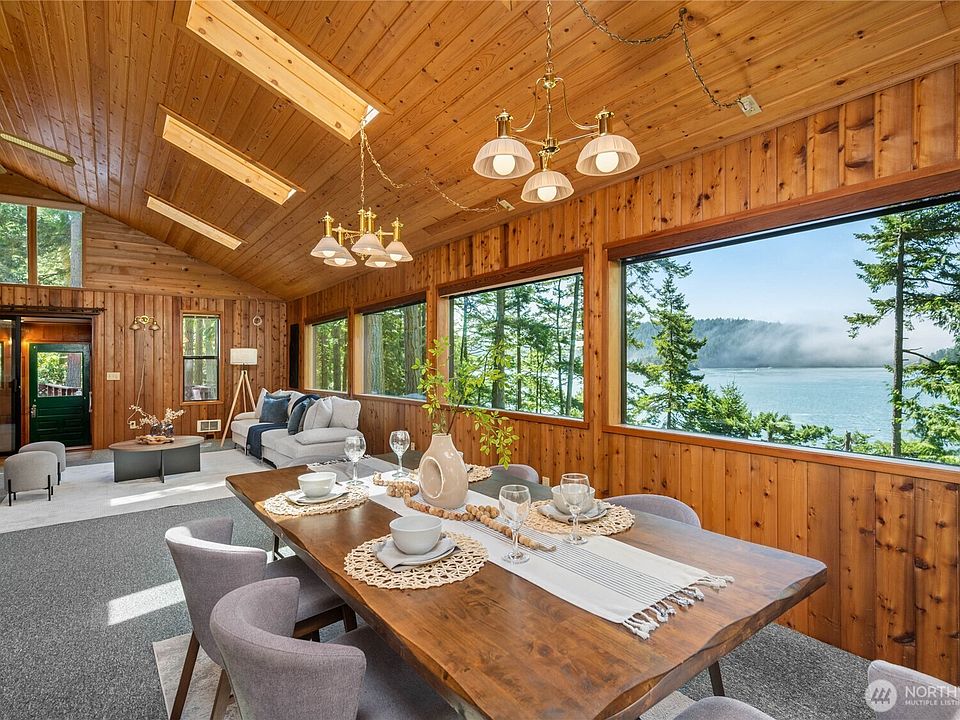 Experience the essence of Pacific Northwest waterfront living on the south side of Fidalgo Island. Tucked amid mature evergreens, this 3 parcel, 2 home estate is nestled on 1.9 private acres. The main residence enjoys an expansive living room, dining room and kitchen space; accented by rustic open-beams, vaulted ceilings with skylights, warm T&G knotty pine finishes along with abundant windows framing the lush forest, turquoise sea, vivid sunsets, and Deception Pass Bridge. A gently sloping path leads down to a private beach with 160' of waterfront and owned tidelands, perfect for mooring a boat, launching kayaks, or strolls on the beach. The custom 1BD/1BA cottage awards a functional space for guests or a property manager.