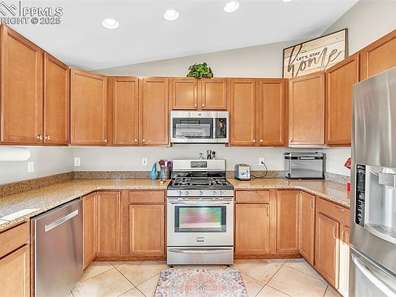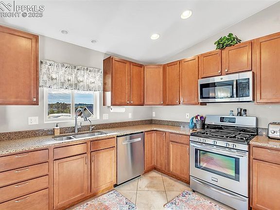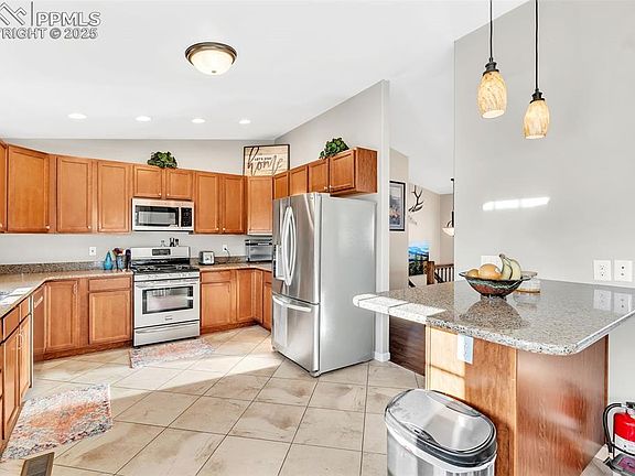 The Colorado experience you've been dreaming about. Situated on 5 acres, the home is ideally situated in the Woodlake area of Blackforest with views of rolling hills and grassy meadows. The main level has a large living room with vaulted ceiling and wood burning fireplace and tons of natural light. The dining room has a walkout onto the wrap around deck which overlooks the tree-lined pasture. You'll enjoy the large kitchen with quartz counters, gas range, breakfast island, shaker cabinets and ceramic tile flooring. Primary suite has vaulted ceilings with a cozy window seat and walk-in closet. The primary bath has double sinks & large freestanding, tiled shower and heated floors. Additional bedroom and bath on main floor. The lower level with a large family room has garden level windows, pellet stove and wood laminate flooring. Lower level bedroom and attached bath make a perfect guest suite. Lower level walks out onto a stamped concrete patio with partial covering from the deck above, perfect spot for a hot tub. Never run out of storage with an attached 2 car garage and large detached 3 car garage with RV door. Perfect for horse lovers with fenced and cross fenced pastures. Stay cool with Central A/C and less maintenance issues as the home was built in 2014 with a new roof, septic and paint in 2023/2024. Buried propane tanks are owned. Recent appraisal above list price.