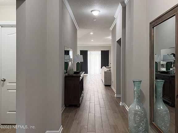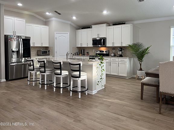 Welcome home to this like new DR Horton ''Lantana'' open concept floorplan in the gated community of Pine Lakes with low HOA fees and NO CDD! This home features 4 bedrooms and 3 full baths. The spacious kitchen comes equip with stainless steel appliances and a neutral backsplash with a large island great for entertaining, overlooking the large living and dining areas. At the front of the home, you will find two bedrooms that share a full bath, a laundry room off the garage, a fourth bedroom that is an optional den, and a powder bath. The primary bedroom has beautiful tray ceilings and the ensuite bathroom comes with dual vanities, step in tile shower and garden tub. Pine Lakes community is convenietly located close to highways, shopping, restaurants, Mayport & NAS Jax.