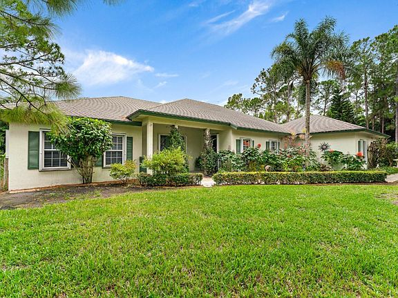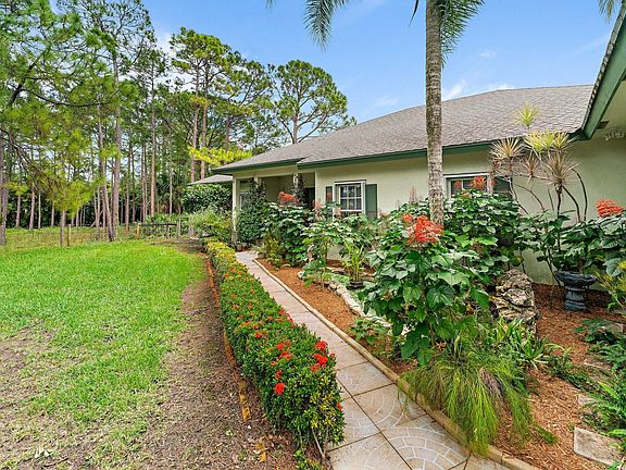 Meticulously maintained in Jupiter Farms! Custom Built home w/open floorplan + easy to care for garden + landscape. Covered, Separate entry to a large Office or 3rd Bed w/ half bath (potential to add shower) provides an array of options; M-I-L suite, homeschool room, studio, live-in accommodations + more. Clean as a whistle! Freshly painted interior w/high-grade vinyl plank flooring throughout. Lightly-used kitchen + baths in pristine condition. Newer SS kitchen appl. featuring double wall oven + cooktop. Spacious dining area, large breakfast bar + tray ceilings are just a few of the added features. Enjoy quiet nights on the sizable, screened lanai w/access from main living areas + primary suite. Possible room for a pool. Solid home + property, well-cared for and loved by original owner. Well-equipped laundry room w/Newer Samsung Washer + Dryer, utility sink and storage. Accordion shutters throughout, hurricane rated garage door, roof has been well-kept + sealed bi-annually for the last decade, fully fenced w/ electric gate at entry. Great separation from neighbors and located in a quiet location along Alexander Run Rd. (paved road). North side is beautifully treed providing a low maintenance buffer. South side by the oversized garage has newer shed and room for expansion. Good curb appeal and inviting home with garden, koi pond, fountain and covered porch. **Opportunity knocking**