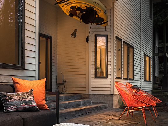 Master on main! Frank Lloyd Wright inspired profile w/ daylight basement. 5bd/3bths + home office, gym/project room & 4car tandem garage. Across from notably best private boat & swim easement. Backs to Lily Bay- enjoy water views and privacy. Extensive improvements in 2017- millwork, paint, lighting, professional low-maint landscape & new kitchen appliances. 2 levels of new covered decks & flagstone patios for waterfront entertaining!