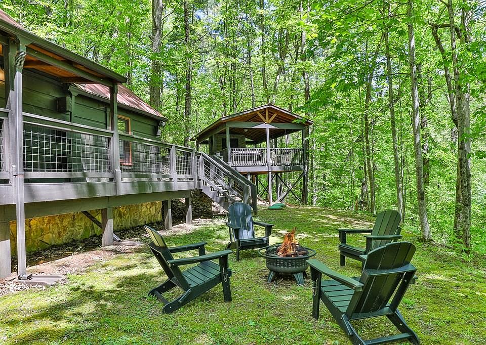 *Back on the market due to no fault of the seller!* If your favorite thing about the North GA Mountains is spending time outdoors, then this is the cabin for you! The abundant outdoor features at this home include: an open deck leading to an outdoor kitchen with built-in grill and tile counters; covered party porch with fireplace, hot tub, space for a tv, and tons of relaxing seating; the perfect spot for roasting marshmallows in the front yard firepit; small pond for practicing your casting; large grassy space perfect to let the kids or dogs run; unique “crows nest” covered deck with a wood burning stove, lounging spots, and an awesome seasonal mountain view; plus a rustic “barn” shed perfect for storing your outdoor gear. The inside of the home is just as amazing as the outside providing plenty of room in an easily manageable size. Featuring vaulted ceilings, warm wood finishes, a cozy great room with fireplace, kitchen with quartz counters, and two well-appointed bedrooms plus 2 bathrooms. Find all this located in the mountain community of Double Knob that is nearby to trails and outdoor adventures, while still being a short drive to Ellijay or Blue Ridge. This would be perfect to own as a relaxing getaway or as a rental investment. Being sold fully furnished, all you need to do is figure which of this cabin's outdoor spots you're going to enjoy watching the fireflies flicker from first!