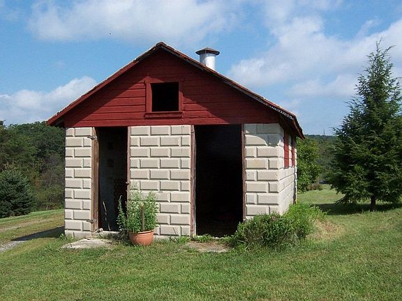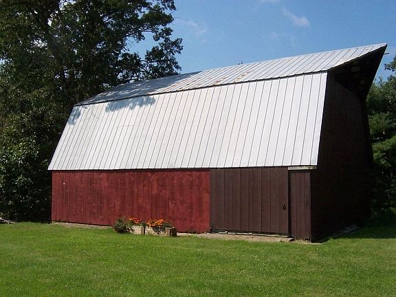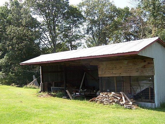 Great Gentleman's Farm. Nice starter home with front porch for relaxing. This 1 bedroom ranch has so many possibilities. Make additions as your family grows. A 40'x30' bank barn, 30'x20' implement shed, Huge workshop has second floor, attached oversized bay for your vehicle and attached storage space, total size 65'x30'. Block utility shed for more storage. All of this on just under 5 acres, 3/4 of an acre of which is woods. Old school house on property needs a lot of TLC, so please do not enter.