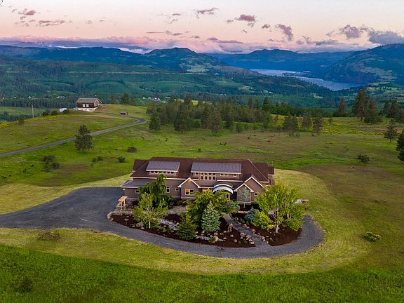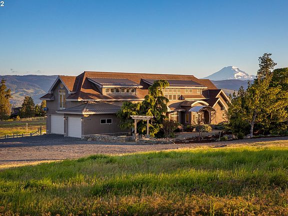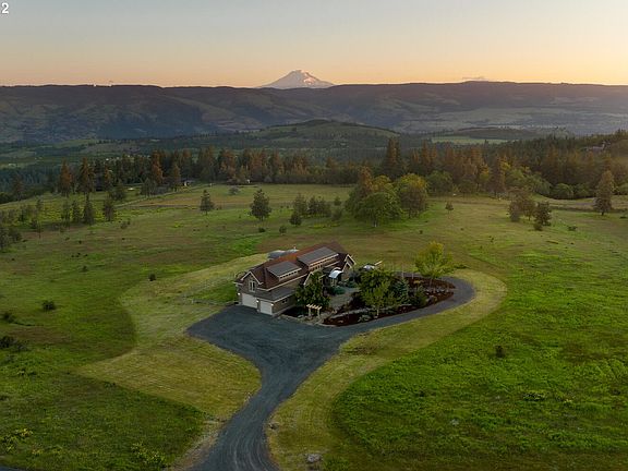 This stunning Pacific Northwest Custom Home offers panoramic views from every window! Sitting on 10+acres, enjoy views of Mt Hood, Mt Adams, The WA Hills & The Columbia River. Abundant with wildlife & open skies for a breathtaking sunrise & sunset. Rich landscape & trees surround the property with a grandeur hardscape entry. Multifunctional home w/ 4 bedrooms, 3.2 baths, two formal offices & large bonus space. Luxe finishes & amenities! Don't miss the partial basement & three-car garage!