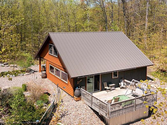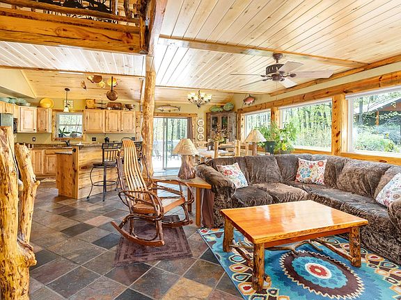 Bustled amongst the trees and surrounded by Mother Nature, sitting on almost 4 serene acres, sits this custom built two bedroom, two bath home. Featuring natural woodwork throughout, slate flooring in the common areas, and loads of natural light, this home is sure to impress. The custom Hickory and Maple railings, rustic Maple cabinets, and granite countertops in the kitchen, White Pine trim, Hickory floors in the primary bedroom, along with a large walk-in closet and ensuite. The attention to detail throughout this home is amazing. Vaulted ceilings allow plenty of natural light. Upper level loft features another good sized bedroom, with a private ensuite and a handsome office area that could also be used for a family room. The home has been plumbed for in-floor heat and is boiler ready if you choose. A detached two car garage, shed, and peaceful landscaping with a Koi pond complete this home.