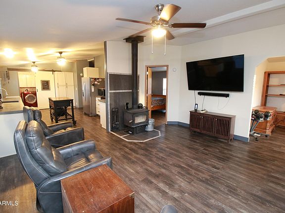 Nestled on a spacious .60-acre lot, this home has a newly remodeled kitchen, 3 bedrooms, 2 bathrooms, w/ the flexibility of converting the office space into a potential 4th bedroom. New metal roof. Custom chain link privacy fence surrounds the back lot. The highlight of the backyard is the 40X 40 garage w/ 16- foot walls & an RV door (12X8 Ft) to keep your RV out of the weather. Additionally, a 10X12 shed provides extra storage space, & an open back lot for more space, propane tank is owned. The inviting jacuzzi offering a perfect spot for relaxation & enjoying the beautiful sunsets in this area. Outdoor enthusiasts will revel in the location, w/ the USFS all around, offering trails for ATVs & exploration galore. The TV & mount, and rolling kitchen island, does not convey.