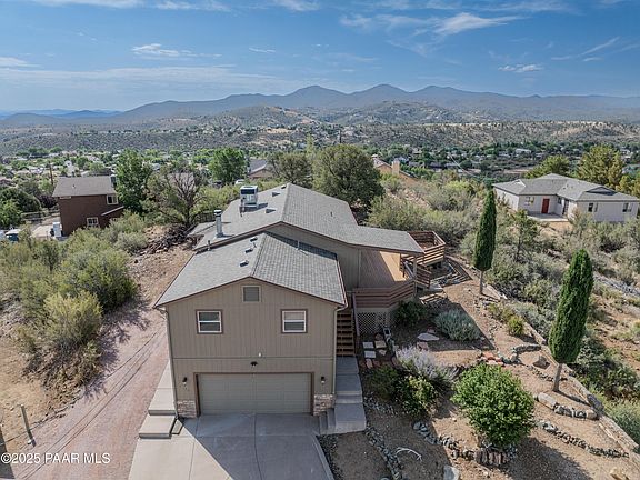 Looking for amazing views, the comforts of home and room for RV parking? This is it! Situated on .28 acre with panoramic views - wowza! Huge deck to relax or entertain and take in those amazing Prescott summer nights! NEW ROOF in 2022, NEW HVAC 2023, freshly painted exterior 2025. Large primary suite with separate entry if desired and kitchenette. Ensuite guest bedroom plus additional guest room and bathroom. HUGE laundry room could be a hobby room, play room or even a bedroom if desired. Open living room & kitchen with woodburning fireplace, all appliances convey including the refrigerator in the primary suite. Property has been surveyed. See docs tab for survey. The area is on private water of Diamond Valley water district. The water tank belongs to the water district and is not on the property. See survey.