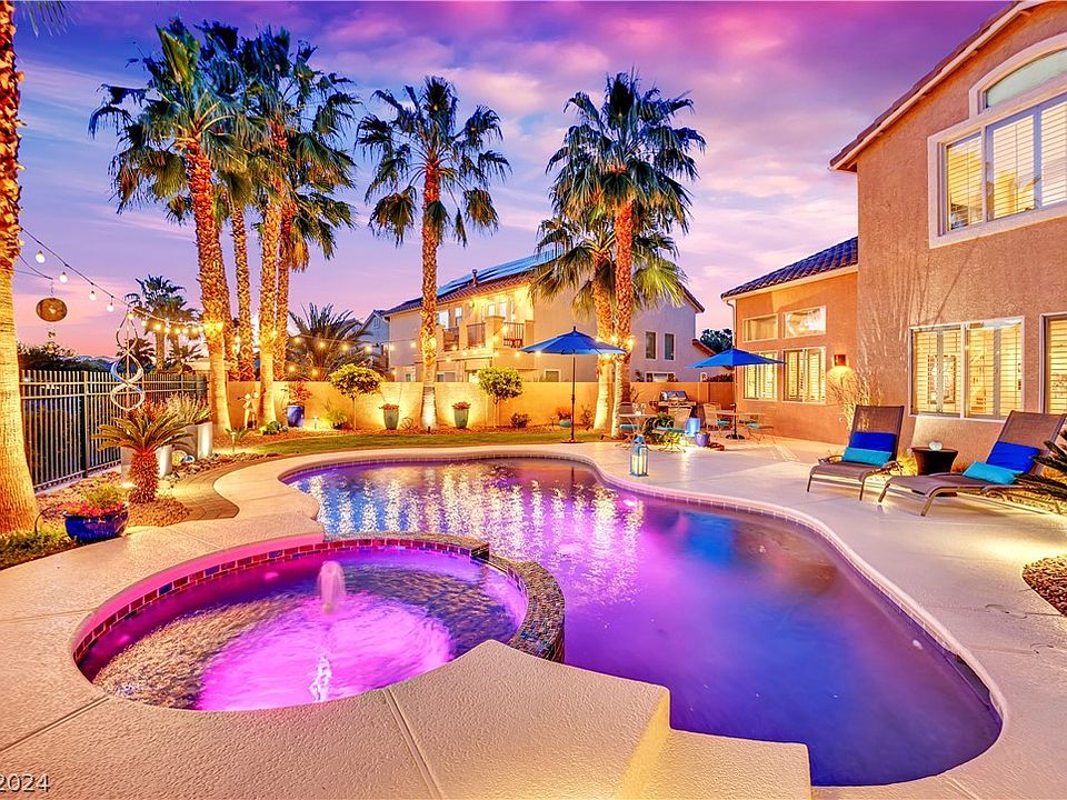 Welcome to this stunning 5-bedroom home nestled in the serene community of 7 Hills. Updated landscaping frames a resurfaced pool with multi-color LED lighting. Enjoy comfort year-round with replaced AC, furnace, water heater, and a new pool heater. Plus, a reverse osmosis system and a newer water softener ensure water quality. Polar Shades keep the home cool. The kitchen is a chef's dream, equipped with granite countertops and name brand appliances. This home has a downstairs bedroom and 3/4 bathroom. All the rooms are oversized with the 5th bedroom that can be turned back into a loft. The primary bathroom has been fully renovated and up to date with today's modern trends. This home has been truly loved inside and out. Completely move in ready including professionally cleaned windows and carpets. 9 well trimmed palm trees really set the tone for an oasis feel! You must see this home light up at night!