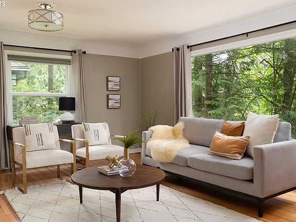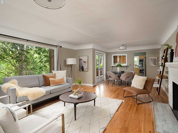Tranquility and serene privacy await you here in the coveted West Highland neighborhood of Portland. This home is situated on a quarter of an acre surrounded by lush forest and towering trees. Classic and contemporary styles blend seamlessly and provide an easy living, modern tree-house feel. The home features an open main level with hardwood floors, cozy wood burning fireplace and dappled light streaming in from every direction. There are endless possibilities with this flexible floor plan - upstairs you'll find a lovely primary en suite, two bedrooms and a full bath on the main plus an additional bedroom and full bath in the lower level with adjacent laundry room and a large family room complete with wood burning fireplace and access to the back patio. Enjoy the outdoor living and play spaces that provide ample opportunity for games, gardening, gathering and grilling. An attached garage opens directly into the kitchen - perfect for those rainy winter months! This special home is tucked away, yet so conveniently located to downtown Portland, Hoyt Arboretum, and the Portland Zoo. Could this retreat be your own personal paradise? [Home Energy Score = 3. HES Report at https://rpt.greenbuildingregistry.com/hes/OR10191629]