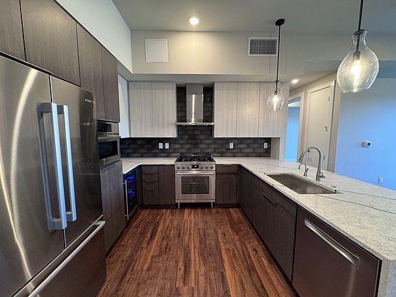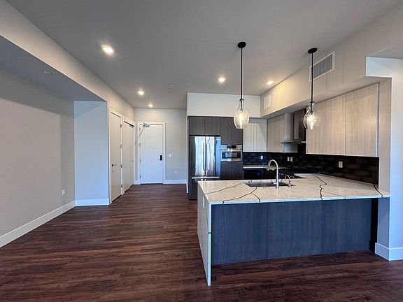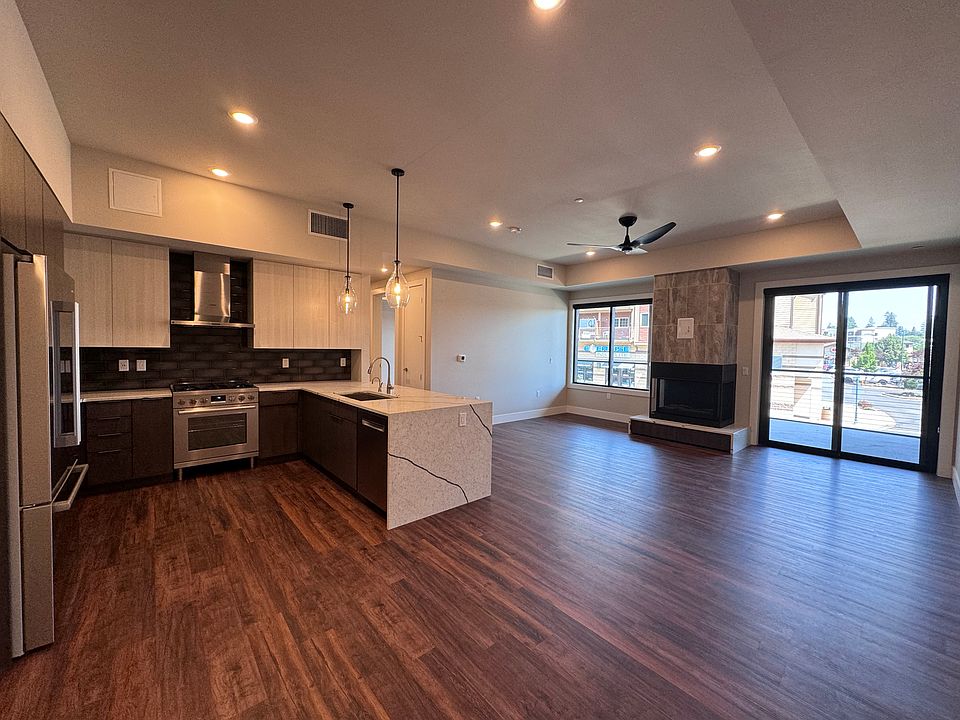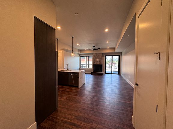 Welcome to this brand new, modern 2-bedroom, 2-bathroom condo located in the heart of Riverstone, Coeur d'Alene's premier lifestyle community. Spanning 1,481 sq ft, this spacious and elegantly designed home offers a perfect blend of comfort and convenience. As you step inside, you'll be greeted by an open-concept living area that features a cozy fireplace, perfect for relaxing evenings. The kitchen comes fully equipped with a refrigerator, microwave, range/oven, and dishwasher, making meal preparation a breeze. You'll also appreciate the included washer and dryer, ensuring laundry day is hassle-free. The bedrooms are designed with your comfort in mind, featuring custom California closets for ample storage. The master suite offers a private bath, while the second bathroom is conveniently located for guests. Blinds are installed throughout the home, adding a touch of privacy and style. Situated in the vibrant Riverstone community, you'll enjoy easy access to a variety of dining, shopping, and entertainment options, all within walking distance. The property is also just minutes away from the scenic Centennial Trail and the beautiful shores of Lake Coeur d'Alene, perfect for outdoor enthusiasts. Rent includes water, garbage, recycling, and sewer services, providing you with a low-maintenance lifestyle in one of Coeur d'Alene's most sought-after locations. Don't miss the opportunity to call this stunning condo your new home! Owner pays water, sewer, garbage and recycling. Tenant pays electrical and internet. No smoking. No pets.