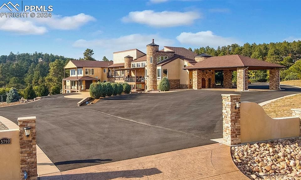 You are invited to explore a property that offers more than just a house—it provides an elevated resort-like lifestyle in the heart of the city. This remarkable property provides acreage and space, along with an unbeatable location just minutes from I-25, shopping, and dining. This custom-built home, set on 5.21 acres, offers an unparalleled lifestyle with a standalone state-of-the-art private fitness center, putting green & basketball court (easily convertible to a pickle ball court). As you approach, a grand porte-cochère greets you—a sight that will take your breath away. Inside, soaring ceilings and unobstructed views of Pikes Peak and the entire Front Range await. The main level is an architectural masterpiece: a living room with a show stopping fireplace, a formal dining room, and a chef's delight gourmet kitchen. French doors lead to a large balcony overlooking the entire Front Range, stand alone fitness center, basketball court and putting green. Back inside, explore the upper level and find the spacious primary suite including walk-in closets, a five-piece spa bathroom, a fireplace, and stunning Pikes Peak views from the balcony. A second spacious room, intentionally designed, could serve as another primary suite or remain a luxury office. Six additional bedrooms most with en-suite bathrooms accommodate family & guests comfortably. Navigate the home effortlessly via stairs, a spiral staircase, or elevator. This one-of-a-kind property also boasts an outstanding entertainment space—or an opportunity for multigenerational living—with an expansive second state of the art chef's kitchen, dining room & living room. Don't miss standout features like the fully soundproofed theater, ballet (or yoga) studio, hidden game room & five car garage. Just as impressive as the inside is the exterior with a paved driveway around the entire home (accommodating parking for up to 200 cars), & two private drives. Your ideal life is within reach—seize it!