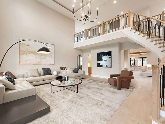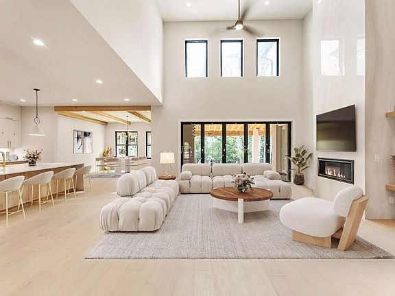 Soaring ceilingsClean architectural linesWaterfall islandWide-plank hardwoodsSculptural curved staircaseFloor-to-ceiling quartz fireplaceWalk-in pantry