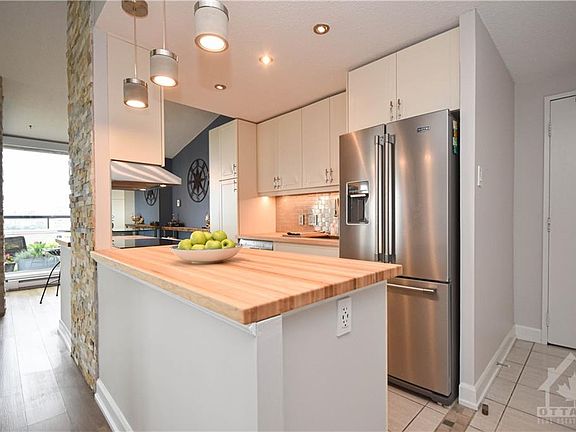 Welcome to this stunning 3 bedroom penthouse condominium with extensive upgrades in the sought after Chateau Vanier that won't disappoint! Open-concept floor plan with expansive living room with floor to ceiling windows & a spacious dining area boasting gleaming floors, large windows & culture stone walls. Gourmet eat-in kitchen with stainless steel appliances, pots & pan drawers & tile backsplash. Expansive primary bedroom with his & her closets & 3 piece en-suite with glass shower. Full bathroom, 2nd bedroom with ample closet space & 3rd bedroom with unique 2 storey loft space. Wraparound windows with custom blinds & balcony with gardens, interlock floor & breathtaking views of Gatineau Hills & Ottawa River! Amenities include: Concierge service, water/sewer, exercise room, indoor pool, sauna, recreation centre, storage locker & 1 underground parking space. Just steps away from onsite convenient store & hair salon & all amenities.
