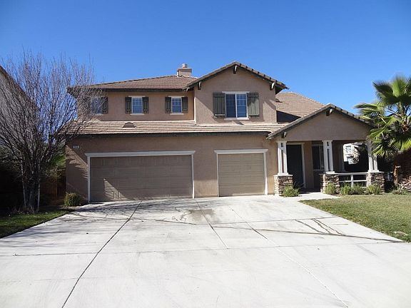 Great 5 bedroom 3 bathroom Perris two story home located in the Monument Ranch community. This home is 3175 square foot home sits on a large 11761 square foot pool sized lot and was built in 2004 and features a 3 car attached garage. The home is located conveniently close to shopping, dining and highway access. There is ceramic tile throughout the dining room and living room with vaulted ceilings. There is a breakfast counter accessible from the dining room that peeks into the kitchen. The kitchen is a good size featuring a ton of cabinet and counter space, an island and an informal dining area as well as additional prep station on the kitchen side of the breakfast counter. The family room has a ceiling fan and fireplace with large media niche for big screen tv. The master bedroom is quite large featuring a retreat and master bathroom that dual sinks, a large soaking tub, separate shower and walk in closet with sliding mirror doors.