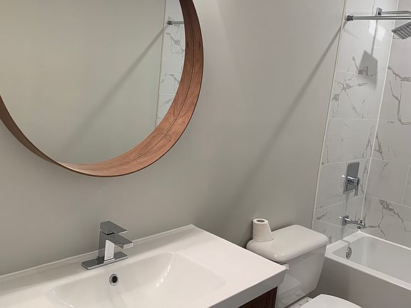 Wall-to-wall closetsModern bathroomStylish kitchenStainless-steel appliancesQuartz counter-topSunny south-facing sunroomHardwood floors