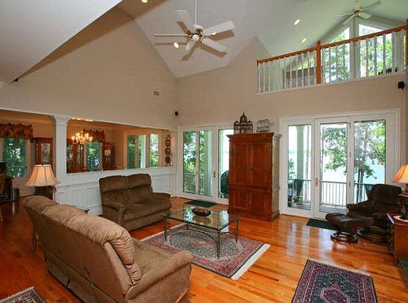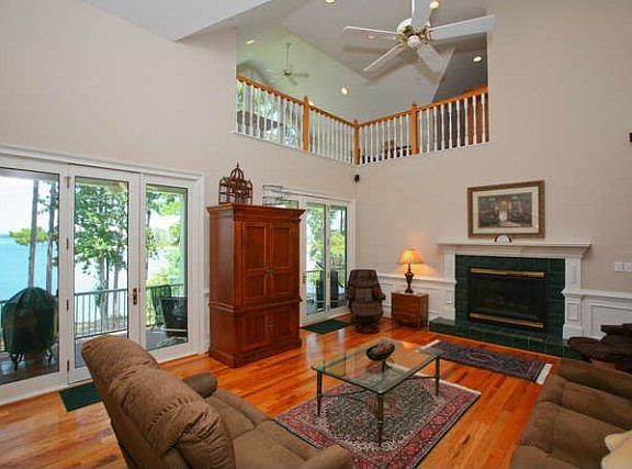 Magnificent waterfront home in Modoc Shores with 600 feet of shoreline and 1 acre of land! Step through the front door and you will be amazed by the perfect floor plan and beautiful views. Hardwood floors flow throughout the first floor. A very open 2 story great room with tiled fireplace. Stunning eat-in kitchen with breakfast bar, eat-in area, and tons of cabinet and counter space. Owner's suite with trey ceiling, doors to balcony, private bathroom which features double vanities, garden tub, standing shower, and walk-in closet. Wrap around loft overlooks great room and features tons attic storage and amazing views of the water. Basement features full kitchen, living area, 2 bedroom, and 2 full bathroom. Large screened-in porch and large covered balcony overlooking beautiful water and view of the best sun set on the lake. 2 Car attached garage & 4 car detached garage with 2685 SF, a full bathroom and heated/cooled. Dock w/deep water. Seller will entertain owner financing.