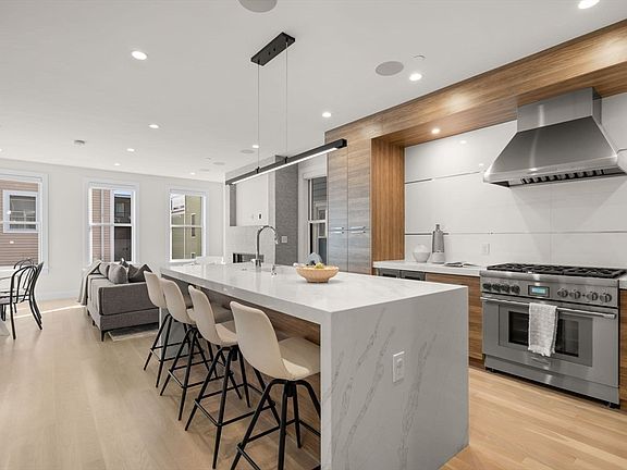 Welcome to 158 Athens, located steps to W. Broadway and the Seaport. Built by and for the owner, every detail is of luxury grade. The custom home boasts a state-of-the-art kitchen with custom wood grain cabinets, a spacious quartz island, and Thermador appliances, opening into a living area with a gas fireplace. The second floor features two large bedrooms and a full bath, providing comfort and privacy. The third floor hosts the master suite, complete with a private deck, a large shower tiled with Porcelanosa, double vanity, and ample walk-in closet space. A wet bar leads to a private rooftop deck with stunning city views. Equipped with central air, surround sound, smart thermostats, and plenty of storage, all set over beautiful white oak floors. It also includes an electric service ready for an EV charger. The 445-square-foot finished basement offers flexible space, ideal for a home gym, playroom, or additional living area. This home perfectly combines luxury with modern convenience.