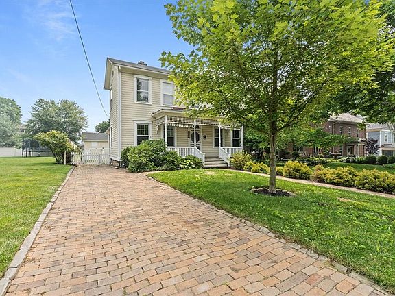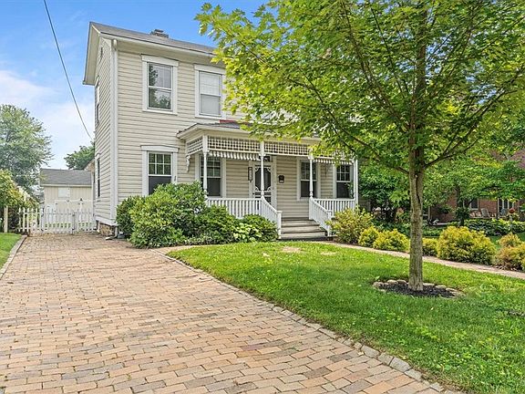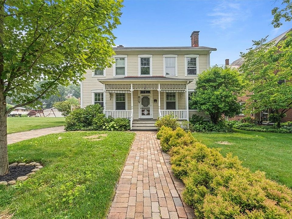 This beautifully restored pre-Victorian home is ready for its new owner. You'll appreciate the care and attention to detail that have been taken into keeping with its history but also incorporating the modern amenities of today. 3 large bedrooms each with a decorative fireplace, original wood floors, trim and working transoms over doors. Full bath up-stairs as well as newer full bath on the main floor. Laundry has also been moved to main floor for convenience. Kitchen boasts hand painted mosaic tiles, and old-world charm including a back staircase leading to upper bedroom. Bright living room and family room each boast original fireplaces; living room fireplace is gas and working! Oversized dining room can accommodate even the largest of family gatherings. Original carriage house with second floor adds character to the exterior charm of the home. Side porch leads to fenced backyard and private perennial gardens. So much history found in this 1820s home!