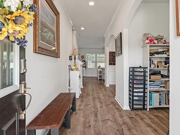 Welcome to this stunning residence in Moncks Corner, thoughtfully upgraded with personal touches. The home features laminate hardwood floors on the first floor, now beautifully mirrored by the newly installed LVP flooring upstairs. The versatile downstairs comprises an office, formal dining room, and a spacious great room opening to a modern kitchen equipped with white cabinets, granite countertops, a gas range, and an impressive pantry.As you ascend the stairs, the charm continues, with the upstairs housing a total of four bedrooms. The spacious master suite is a true oasis, featuring a walk-in closet, double vanity, and a large shower, offering you a private retreat to relax and unwind. The three additional bedrooms provide ample space for your family or guests, and one of them has been creatively transformed into a combined nursery and workout room, showcasing the home's flexibility to cater to your lifestyle needs. For added convenience, the upstairs laundry room now boasts a new utility sink, making laundry days a breeze. But the real magic awaits you outside, where the joy of outdoor living comes to life. A newly installed paver patio invites you to lounge and entertain, while the bench seating and fire pit create the perfect ambiance for gatherings with friends and family. The addition of a charming bridge and rock river enhances the landscaping, adding a touch of enchantment to the backyard. Security is paramount, and the home features a floodlight with a camera over the garage and floodlights at the back corners of the house, providing peace of mind for you and your loved ones. Rest assured, these features can be transferred to the new owner if desired. Embrace the tranquility of this residence as you enjoy tranquil views of the peaceful wooded buffer surrounding the property. This, combined with the convenience of nearby local amenities, offers a harmonious blend of charm, comfort, and practicality. Welcome to your dream home, where every detail has been carefully curated to cater to your modern lifestyle. Experience the joy of living in this thoughtfully upgraded Moncks Corner residence, where charm, comfort, and convenience come together to create the perfect haven for you and your family.