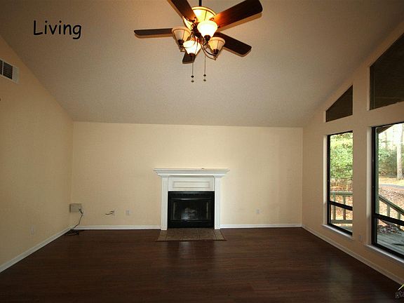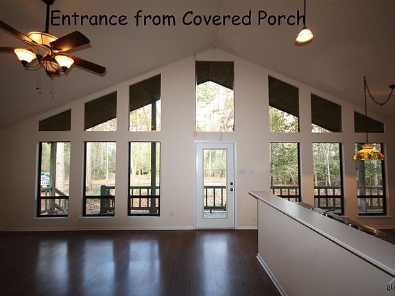 Super-sized two bedroom, two bath home with two car carport, wrap-around decking, set in a heavily, wooded, secluded part of the gated Holly Lake Ranch community. Typical 2-2 homes of this type are usually no more than 1100 or 1200 sq. ft. of living area. This one is nearly 1550 square feet; usually what you would find in a 3 bedroom home. All of the rooms are large, spacious and appealing. Living, kitchen, dining area is open, infused with natural light and comfortable. Cathedral ceiling, floor to vaulted ceiling front wall is nearly solid glass, covered front porch provides just enough shade from the sun, but not so much as to block out the natural light. Sunroom off the kitchen can be great for seating out, used as a dining room or office. Master bedroom is huge. Walk-in closets in both bedrooms. Front covered deck wraps around to the side of the home into an open deck. Two car carport could be made into garage, storage at the end of the carport. Well worth a look before you buy!!