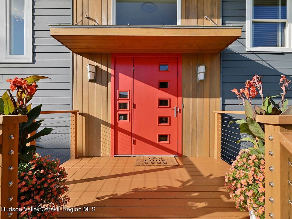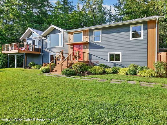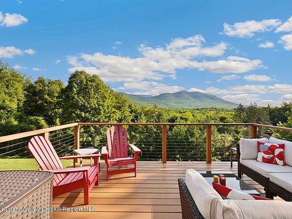 Welcome to this extraordinary, fully-remodeled luxury home in the heart of historic Woodstock. This one-of-a-kind custom contemporary residence offers picture-perfect year-round mountain views that will take your breath away. From the moment you arrive, you'll be captivated by the serene beauty that surrounds you, whether you're lounging on the expansive rear deck, immersed in nature, or enjoying the panoramic vistas from the elevated front balcony. Meticulously cared for and thoughtfully updated, this turn-key property boasts an effortless layout ideal for entertaining. The gourmet kitchen, outfitted with top-end appliances, flows seamlessly into the dining area, family room and living room, all framed by custom architectural windows that lead up to intricate vaulted ceilings, providing stunning views of the Catskill Mountains. Multiple sliding doors open onto decks that offer a perfect setting for relaxing or outdoor dining , making it an entertainer's paradise.