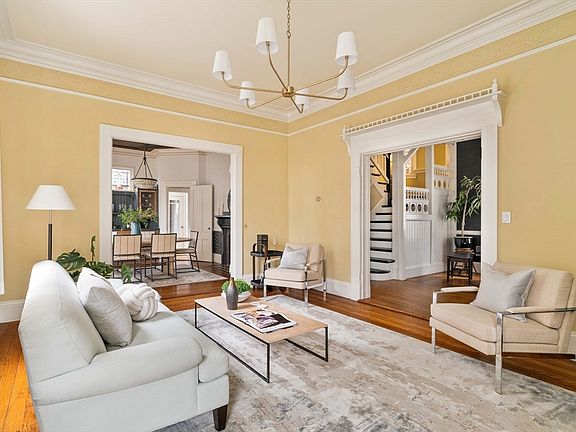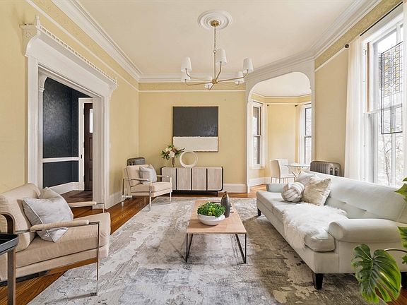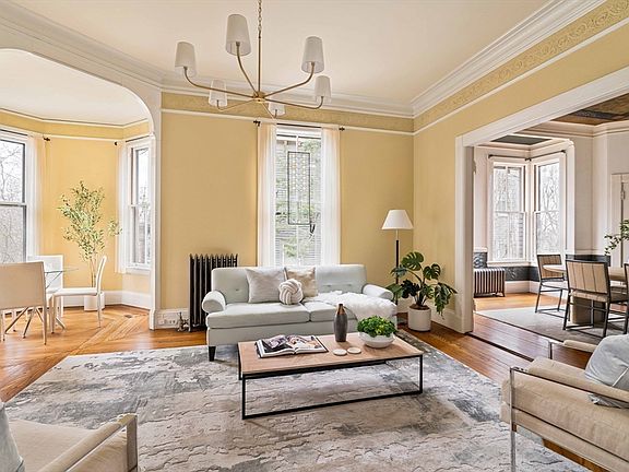Step into history with this Queen Anne gem! This stately home in the Second Empire style features incredible millwork, 11’ ceilings with frescoed panels, crown moldings, 3 fireplaces, and a dramatic entry and vestibule. With 5 bedrooms, a den and 2½ baths on 3 floors, it offers an eat-in kitchen, 2-car driveway, and a large fully fenced yard with mature landscaping. There is hardwood flooring throughout, a sunlit room in the front turret, a formal dining room, and a formidable staircase with ornate banisters and stained-glass windows on each landing. The owners took great care to restore original details while outfitting the home with modern conveniences including AC, updated kitchen & baths, 200 amp electric, and perimeter drains. Officially named the ‘Anna F. Darling House’, this architecturally significant building is located in Winter Hill, only ½ mile to the Gilman Square green line MBTA stop, Rte. 93, and notable restaurants like Sarma & Highland Kitchen.